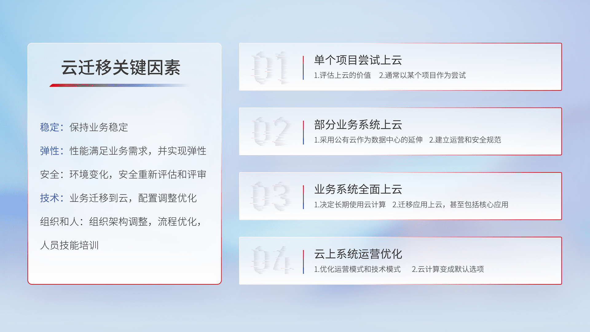 结合实际业务,,从规划设计、、、云平台选型、、云原生改造、、数据迁移、、、集成交付,,迁移全过程为客户识别最佳上云路径,,,做好风险识别管理,,,,设计网络架构、、、、身份权限、、、安全审计合规、、操作审计、、日志审计、、监控告警策略、、、、多站点容灾设计等,,,,对云上基础设施进行整体规划,,提升IT治理水平,,,,以满足弹性、、、、高可用、、、、高性能的需求。。